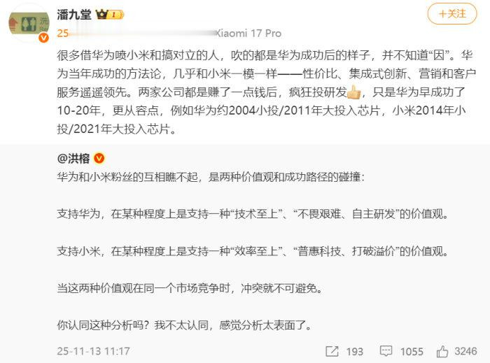 对此,小米集团参谋长潘九堂转发该条微博,并分享自己的观点:很多借华为喷小米和搞对立的人,吹的都是华为成功后的样子,并不知道“因”。华为当年成功的方法论,几乎和小米一模一样——性价比、集成式创新、营销和客户服务遥遥领先。两家公司都是赚了一点钱后,疯狂投研发,只是华为早成功了10-20年,更从容点,例如华为约2004年小投/2011年大投入芯片,小米2014年小投/2021年大投入芯片。