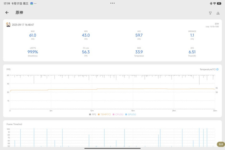 游戏测试部分,我们以《原神》作为测试项目,在全高画质的30分钟跑图测试中,我们这台小米平板8Pro的平均帧率达到了59.7FPS,整体的游戏体验还是很流畅的。