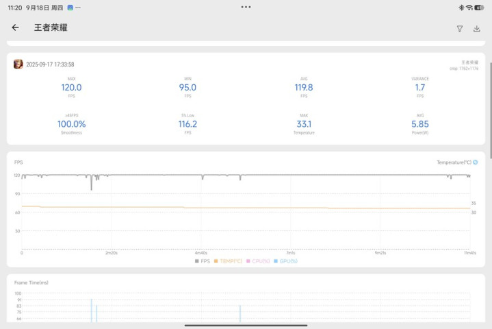 在《王者荣耀》游戏中,小米平板8Pro在高清画质下玩一局游戏平均帧率可以达到119.8FPS,全程都很丝滑。