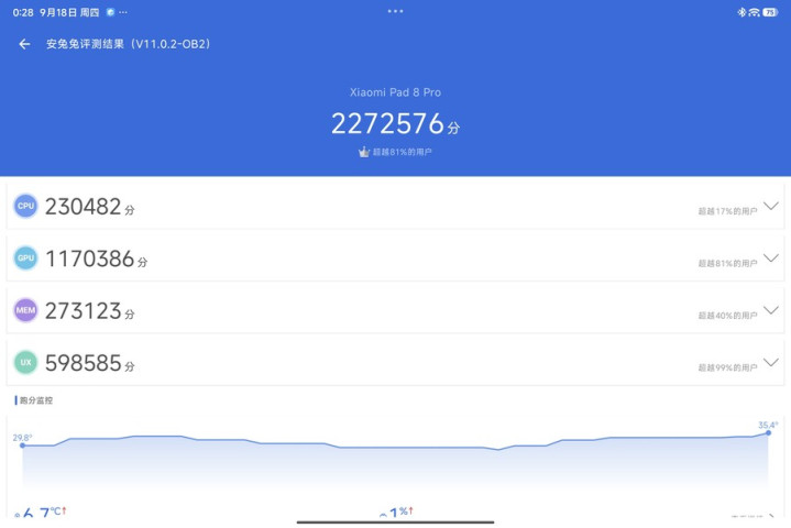 在最新版的安兔兔跑分中,我们这台小米平板8Pro取得了2272576分的成绩。