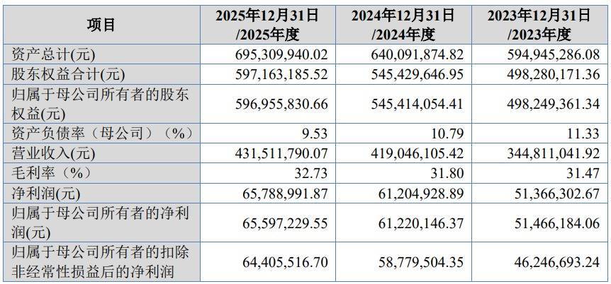 2023年至2025年,创达新材的营业收入分别为34,481.10万元、41,904.61万元和43,151.18万元;净利润分别为5,136.63万元、6,120.49万元和6,578.90万元;归属于母公司股东的净利润分别为5,146.62万元、6,122.01万元和6,559.72万元;扣除非经常性损益后归属于母公司股东的净利润分别为4,624.67万元、5,877.95万元和6,440.55万元。