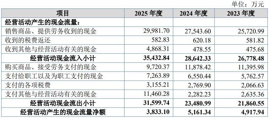 上述同期,公司销售商品、提供劳务收到的现金分别为25,720.99万元、27,543.60万元和29,981.70万元;经营活动产生的现金流量净额分别为4,917.94万元、5,161.34万元和3,833.10万元。