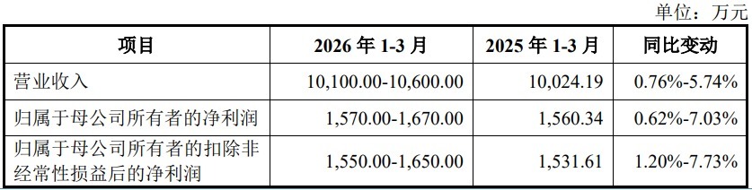 公司预计2026年1-3月实现营业收入约为10,100.00万元至10,600.00万元,同比增长幅度约为0.76%至5.74%;预计实现归属于母公司所有者的净利润约为1,570.00万元至1,670.00万元,同比增长幅度约为0.62%至7.03%;预计实现扣除非经常性损益后归属于母公司股东的净利润约为1,550.00万元至1,650.00万元,同比增长幅度约为1.20%至7.73%。