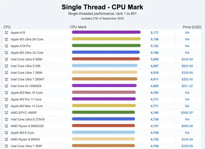 从 PassMark 给出的单核性能跑分来看,A19 单核性能达到了 5149 分,不仅仅比 A19 Pro 要强,甚至超越了苹果 M3 Ultra ,英特尔 Core Ultra 9 285K 这种超级桌面芯片。