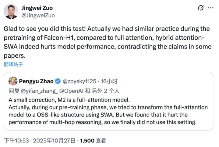 不过Minimax NLP负责人指正,表示一开始确实想在预训练阶段引入SWA,但发现会造成性能损失,所以最后使用的是全注意力。