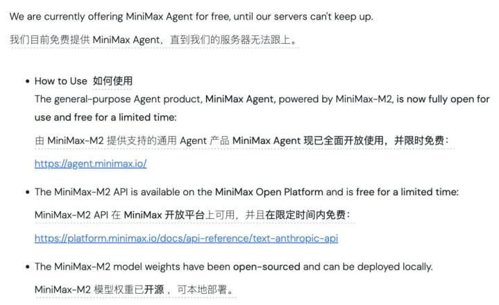 为了更直观地体现M2的Agent能力,Minimax已经把M2部署到了Agent平台,限时免费使用,按官方说法,免费期直到服务器扛不住为止。