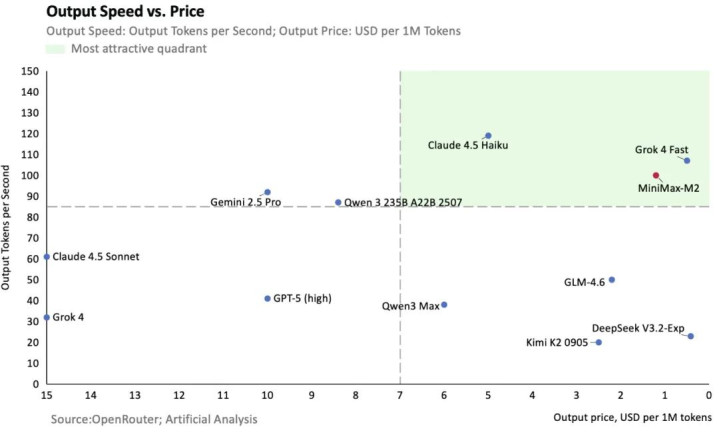 以Artificial Analysis的成绩为基准,Minimax绘制了一张图来比较各大模型性价比(横轴越向右成本越低)。