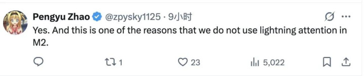 同时,M2也没有采用Lightning Attention(线性注意力的一种变体),原因也是因为性能损失。