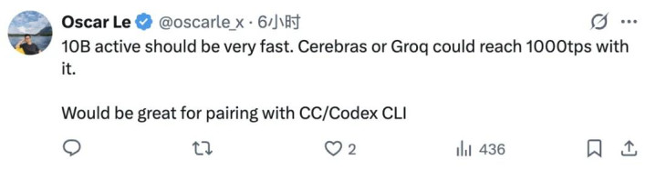 网友表示10B的激活参数运行起来会非常快,如果配上Cerebras或者Groq这样的推理加速平台,有望跑到每秒上千Token。