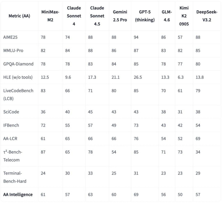 在第三方评测机构Artificial Analysis的测试中,Minimax M2以61分获得了开源模型第一,紧随Claude 4.5 Sonnet。