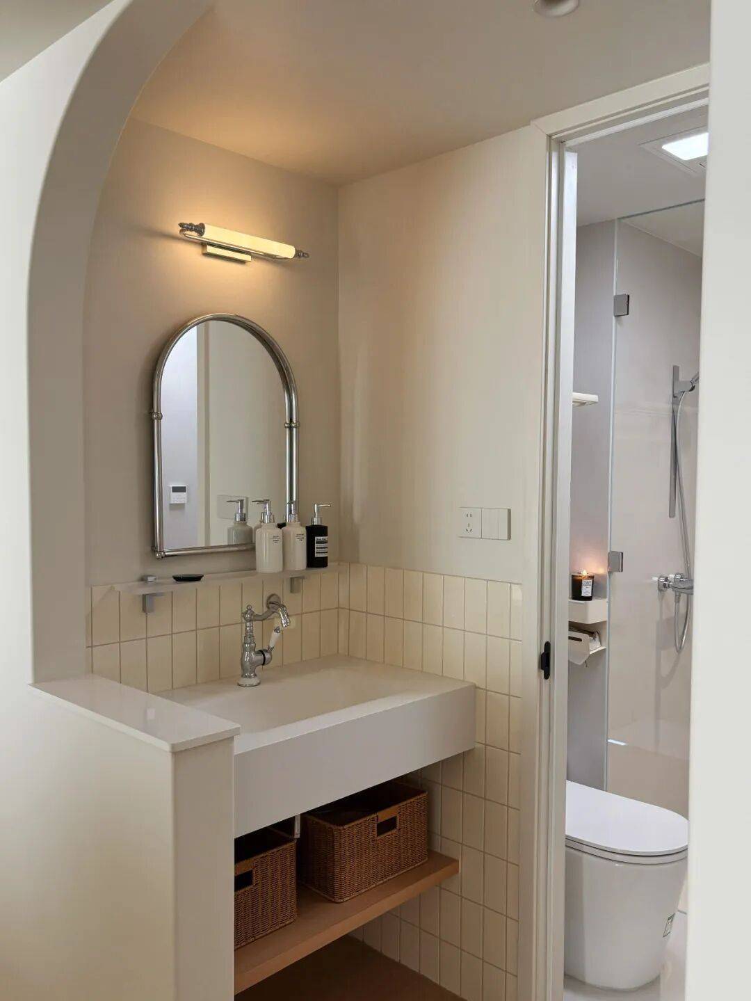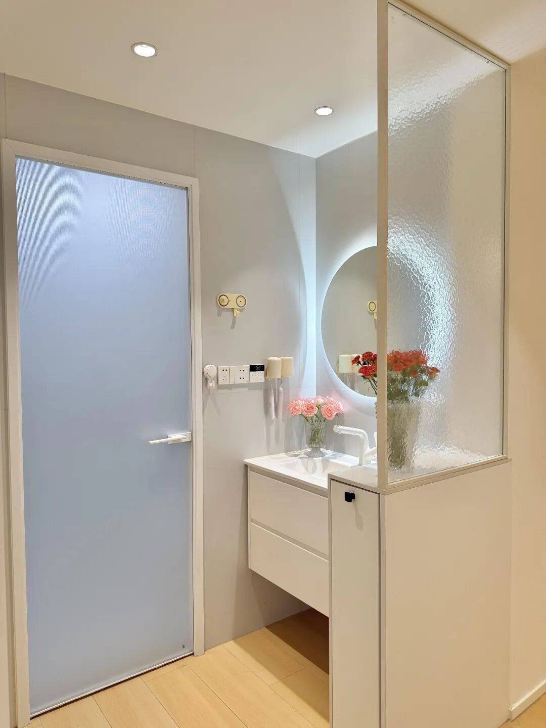 如今的卫生间干区,基本上都是“柜子+玻璃”设计了,既起到了遮挡凌乱的作用,又兼具了一些储物力。