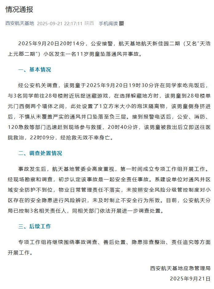 事故发生后,航天基地管委会高度重视,第一时间成立专项工作组开展工作。经现场勘察和调查,初步认定该事故是一起安全责任事故。系建设单位对通风井区域安全防护不到位,物业日常管理责任不落实,未按照安全风险分级管控制度对小区存在的安全隐患进行风险辨识,未及时制止不安全行为所致。目前,公安航天分局已控制3名相关责任人,同相关部门依法开展进一步调查处置。