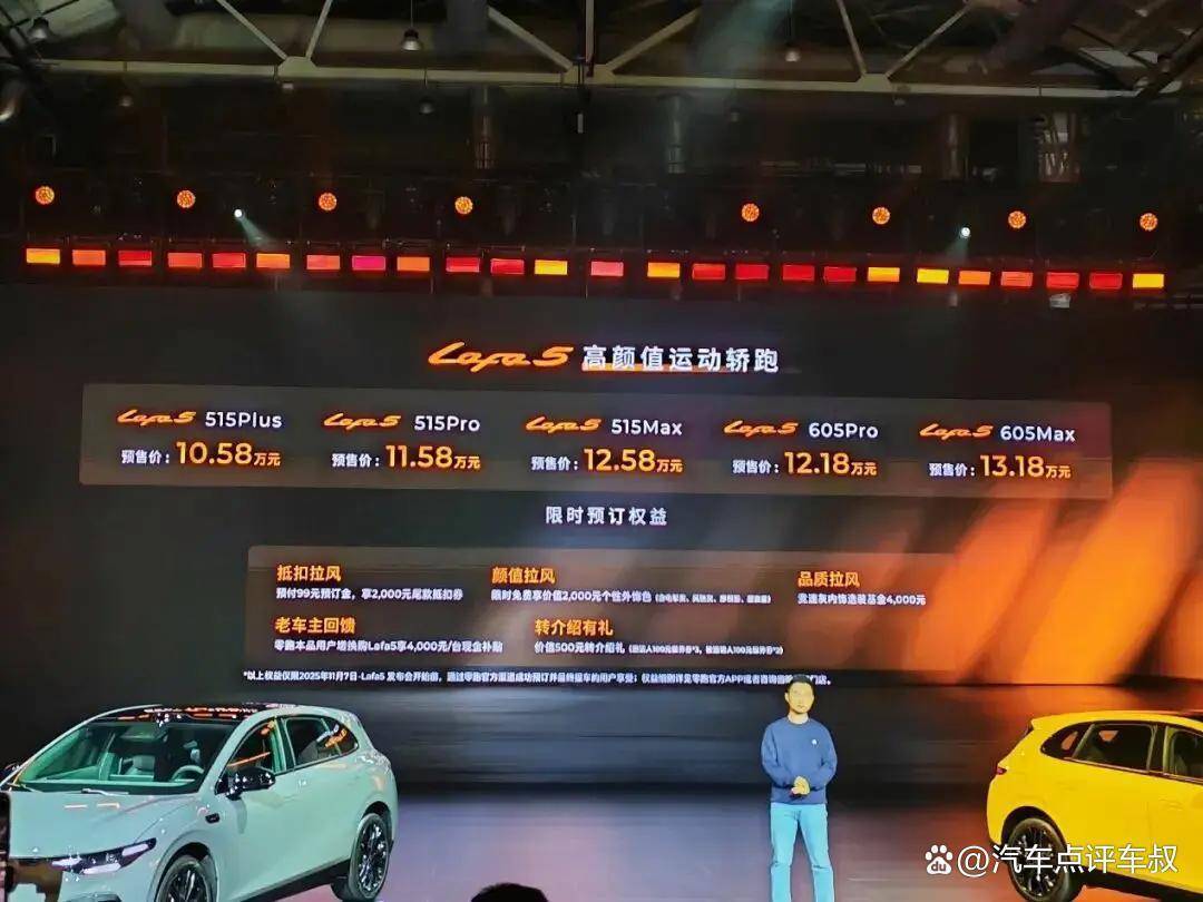 零跑Lafa5于2025年11月7日正式开启预售,共推出5款配置车型,提供515km和605km两种续航版本,预售价格区间为10.58-13.18万元。为降低年轻用户的决策门槛,零跑推出了颇具诚意的预售权益:在2025年11月7日至正式上市期间,消费者支付99元预订金即可享受至高价值12500元的权益,包括2000元尾款抵扣券、限时免费个性外饰色、4000元竞速灰内饰选装基金等。老用户增换购还可享受4000元现金补贴,进一步提升了购车吸引力。