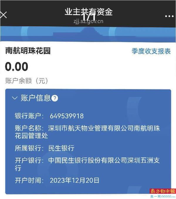 南航明珠花园业主共有资金显示为0元。受访者供图